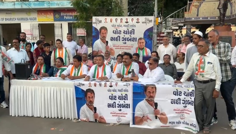 ભરૂચ જિલ્લામાં વોટ ચોર ગાદી છોડ અને મારો મત મારો અધિકાર રાજ્યવ્યાપી અભિયાન અંતર્ગત ભરૂચ જિલ્લા કોંગ્રેસ અને શહેર કોંગ્રેસ સમિતિ દ્વારા અભિયાનની પુર્ણાહુતી કરવામાં આવી હતી. આ અવસરે શહેરના રેલવે સ્ટેશન નજીક સ્થિત ડો. બાબાસાહેબ આંબેડકરની પ્રતિમા પાસે સહી અને મિસકોલ ઝુંબેશનું આયોજન કરવામાં આવ્યું હતું. અભિયાન દરમિયાન ભરૂચ શહેરના વિવિધ વોર્ડ તેમજ જિલ્લામાં તાલુકા મથક સ્તરે કોંગ્રેસ દ્વારા કાર્યક્રમો યોજાયા હતા, જેમાં ભાજપ સરકાર પર “વોટ ચોરી કરીને સત્તા કબજે કરવાના” આક્ષેપો સાથે લોકશાહી બચાવવા અપીલ કરવામાં આવી હતી.તારીખ 3 થી 10 ઓક્ટોબર દરમિયાન ચાલેલા આ અભિયાનમાં કોંગ્રેસના આગેવાનો અને કાર્યકરો ઉત્સાહપૂર્વક જોડાયા હતાઅંતિમ દિવસે યોજાયેલા કાર્યક્રમમાં જિલ્લા કોંગ્રેસ પ્રમુખ રાજેન્દ્રસિંહ રણા, શહેર કોંગ્રેસ પ્રમુખ સલીમ અમદાવાદી, ઝુબેર પટેલ સહિતના આગેવાનો અને કાર્યકરો ઉપસ્થિત રહ્યા હતા.કાર્યક્રમ દરમિયાન આગેવાનો દ્વારા પ્રજાએ આપેલા સહકાર બદલ આભાર વ્યક્ત કરવામાં આવ્યો હતો